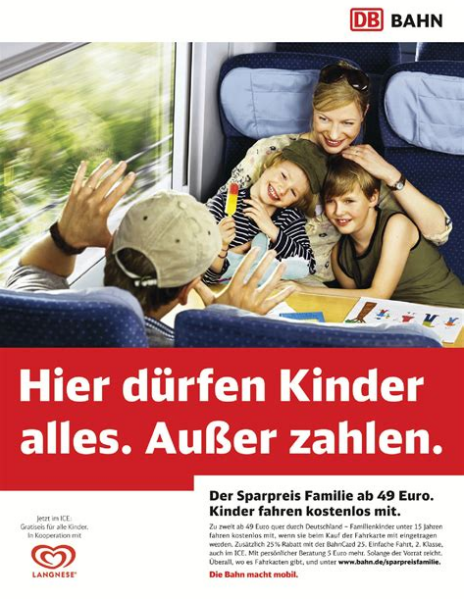 Die Worte „Hier dürfen Kinder alles. Außer zahlen“ stehen dabei für die Freiheit von Verboten, wobei das einzige „unerwünschte Verhalten“ darin bestehen würde, für die Beförderung von Kindern Geld zu verlangen. Der Verweis auf „Gratiseis“ für Kinder im ICE links unten verstärkt diese Botschaft. Dies bedeutet nichts Anderes, als dass die Bahn für Familien die Möglichkeit bereithält, auf angenehme Weise Zeit miteinander zu verbringen: Wenn die Kinder glücklich sind, sind Vater und Mutter dies auch. Eine Reise mit der Bahn stellt für die gesamte Familie demnach also einen geschützten, weitgehend stressfreien Raum dar.